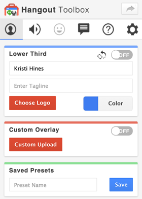 The Hangout Toolbox app icon triggers a box of features you can use to further enhance your hangout. In the example below, you can see how to add a lower-third banner with your name tagline or a custom overlay image so every person on the hangout is identified when they’re on video.